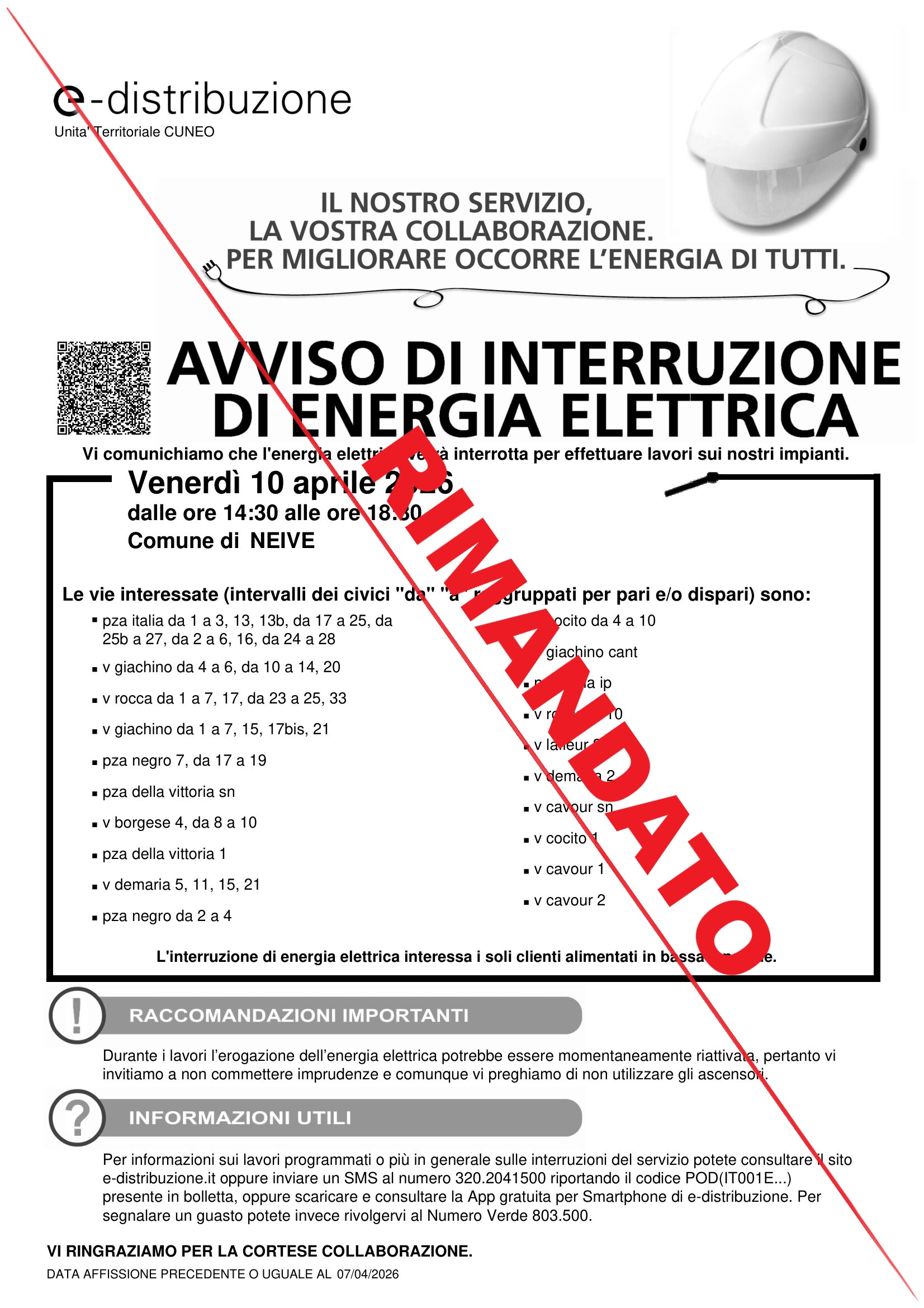 Si avvisa che l'intervento previsto per venerdì 10 aprile da Enel è stato rimandato a data da destinarsi.